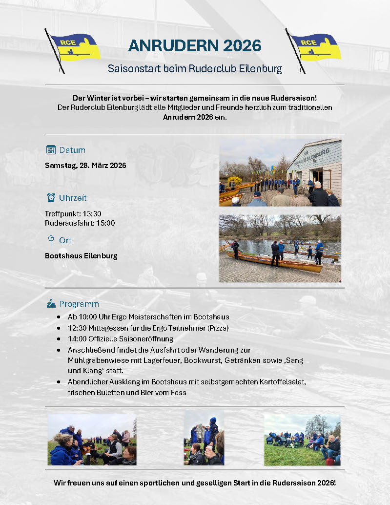 Der Ruderclub in Eilenburg hat wegen der bestehenden großen Nachfrage für das kommende Jahr erneut einen Lehrgang zum Erwerb des „Sportbootführerschein Binnen (Motor)“ geplant. Diese Maßnahme umfasst neben einem theoretischen Teil im zeitigen Frühjahr (14.03.2026 + 11.04.2026, jeweils 3 h) auch eine umfassende praktische Motorboot- Fahrausbildung, inklusive Knotenkunde. Erfahrene Ausbilder sorgen dafür, dass alle Teilnehmer gründlich auf die am 26.06.2026 stattfindende Prüfung vorbereitet werden.