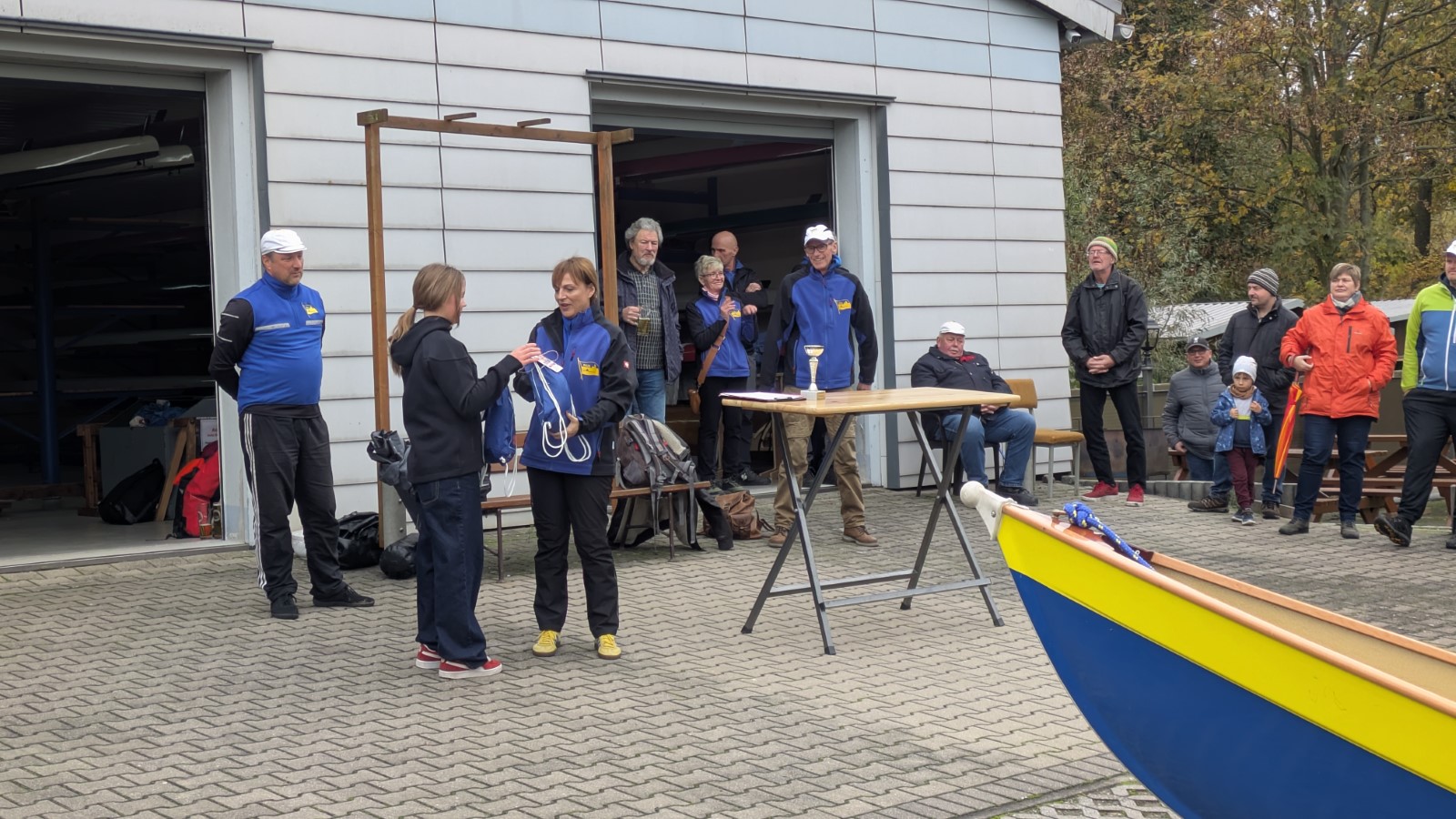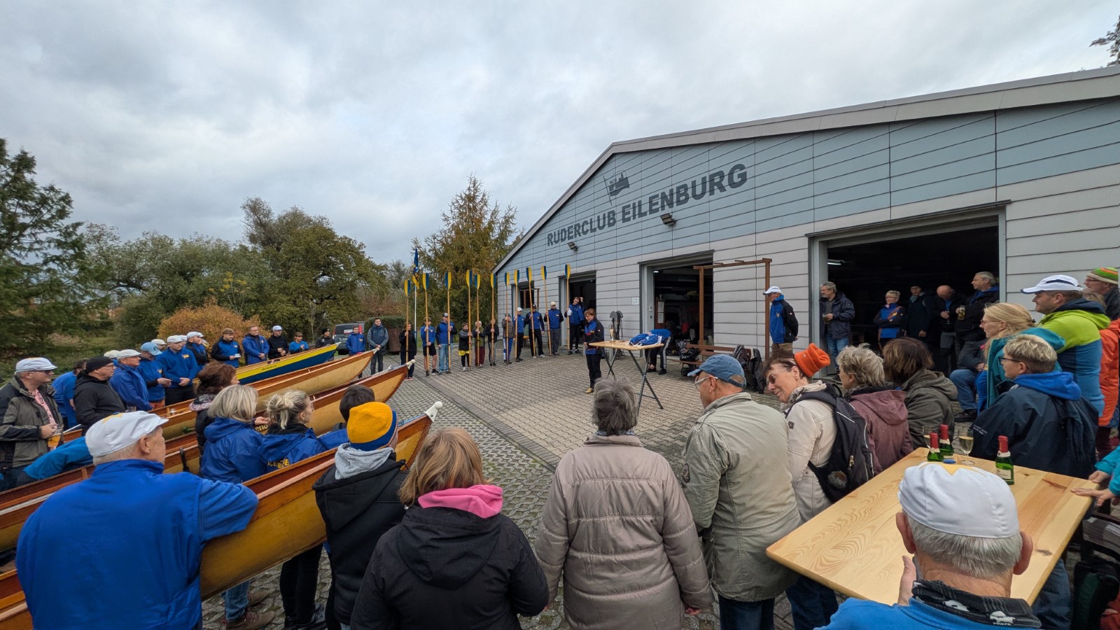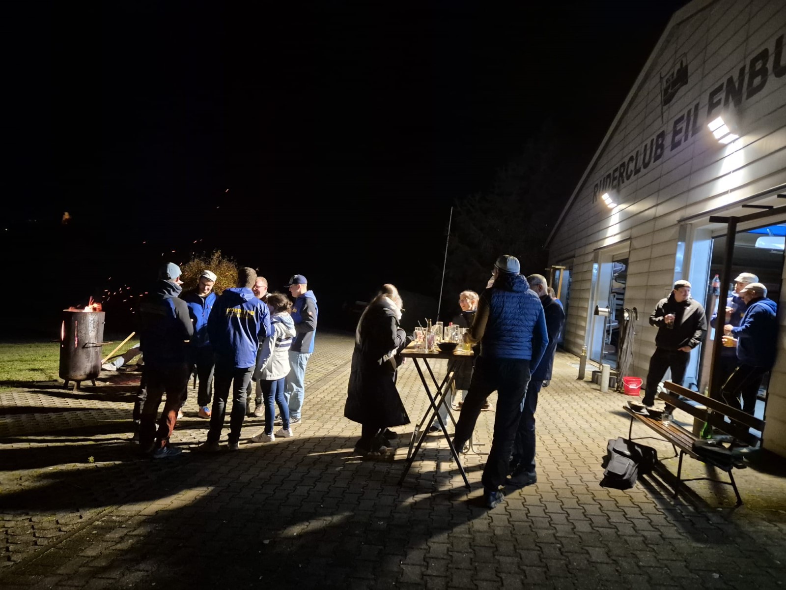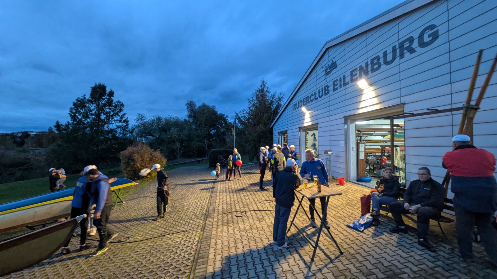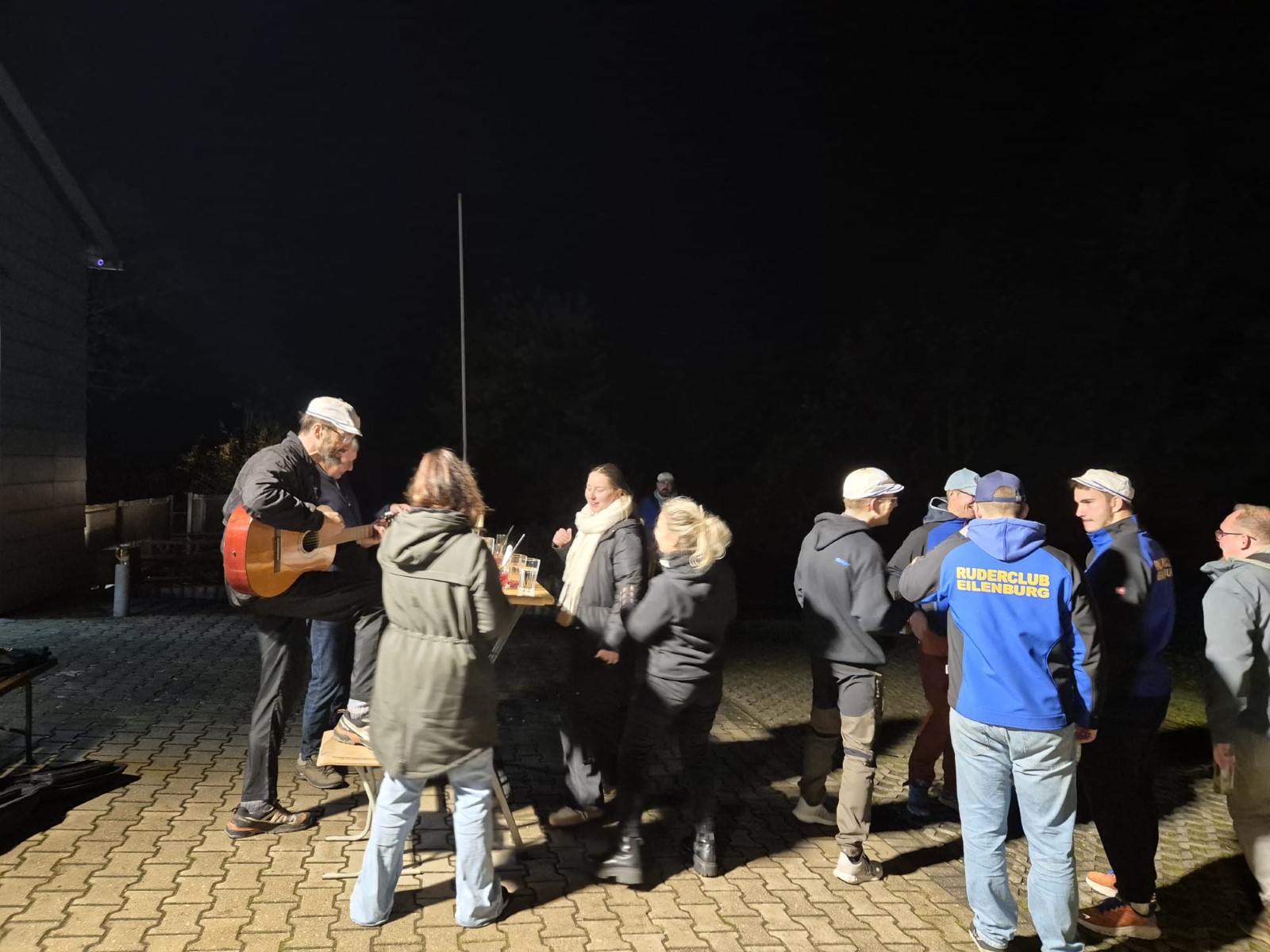 Prinzipiell war alles wie immer, am letzten Oktobersamstag 2025. Und wie immer gab es auch ein paar Abweichungen... Nur wenige Kinder und Jugendliche beteiligten sich diesmal am Ergometerwettstreit. Nudeln gab es trotzdem zu Mittag. Bei der Gig-Vierer-Vereinsmeisterschaft fanden sich zwei Mannschaften, um gesteuert vom Matthias gegeneinander anzutreten. Das Rennen machten Niclas, Arne, Colin und Johann mit fünf Sekunden Vorsprung. Die Ansprache der Vorsitzenden Silke Gans begann mit einem Gedenken an unseren allseits geschätzten Clubkameraden Günter Illgen, verstorben erst vor wenigen Tagen nach kurzer Krankheit. Es folgten ein Rückblick auf die vergangene Saison, der Ausblick auf Kommendes, die Begrüßung neuer Mitglieder, verschiedene Ehrungen und der Aufruf, ein letztes Mal für diese Saison „die Ruder zur Hand und die Boote zu Wasser zu lassen“. Das letztere wehte der Wind derweil auch immer mal wieder in leichten Schauern über alle hinweg, die sich auf der Mühlgrabenwiese versammelt hatten. Sie kamen nicht nur auf dem Wasserweg, sondern nach dem Kaffee- und Kuchen-Genuss auch über Land hinzu. Am Feuer, mit mal mehr, mal weniger Regenzeug ließ es sich aber aushalten. Würstchen und Stockbrot fanden genauso wie Getränke und Gesangseinlagen regen Zuspruch. Mit Einbruch der Dämmerung waren alle Boote wieder unter Dach und Fach. Ob gemütlich im Saal oder mehr oder weniger feucht vor der Bootshalle mit Feuertonne, Liedgut und Co... Es wurde noch bis weit in die Nacht hinein gefeiert. Großes Dankeschön an alle für das Engagement dafür!