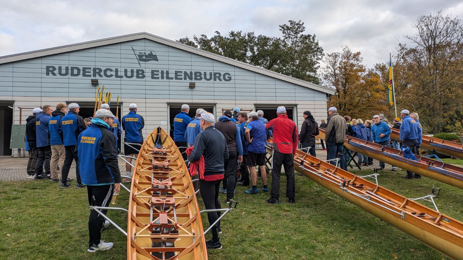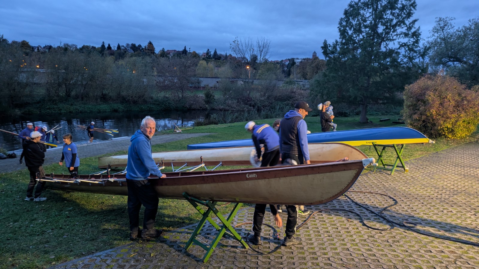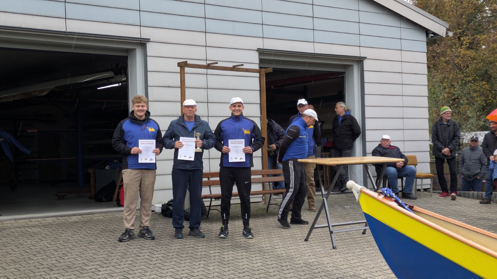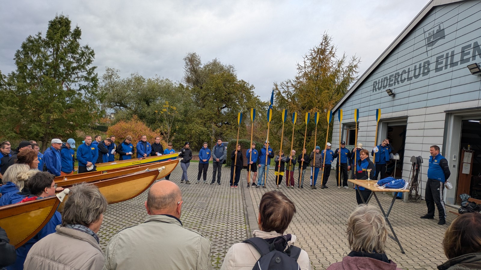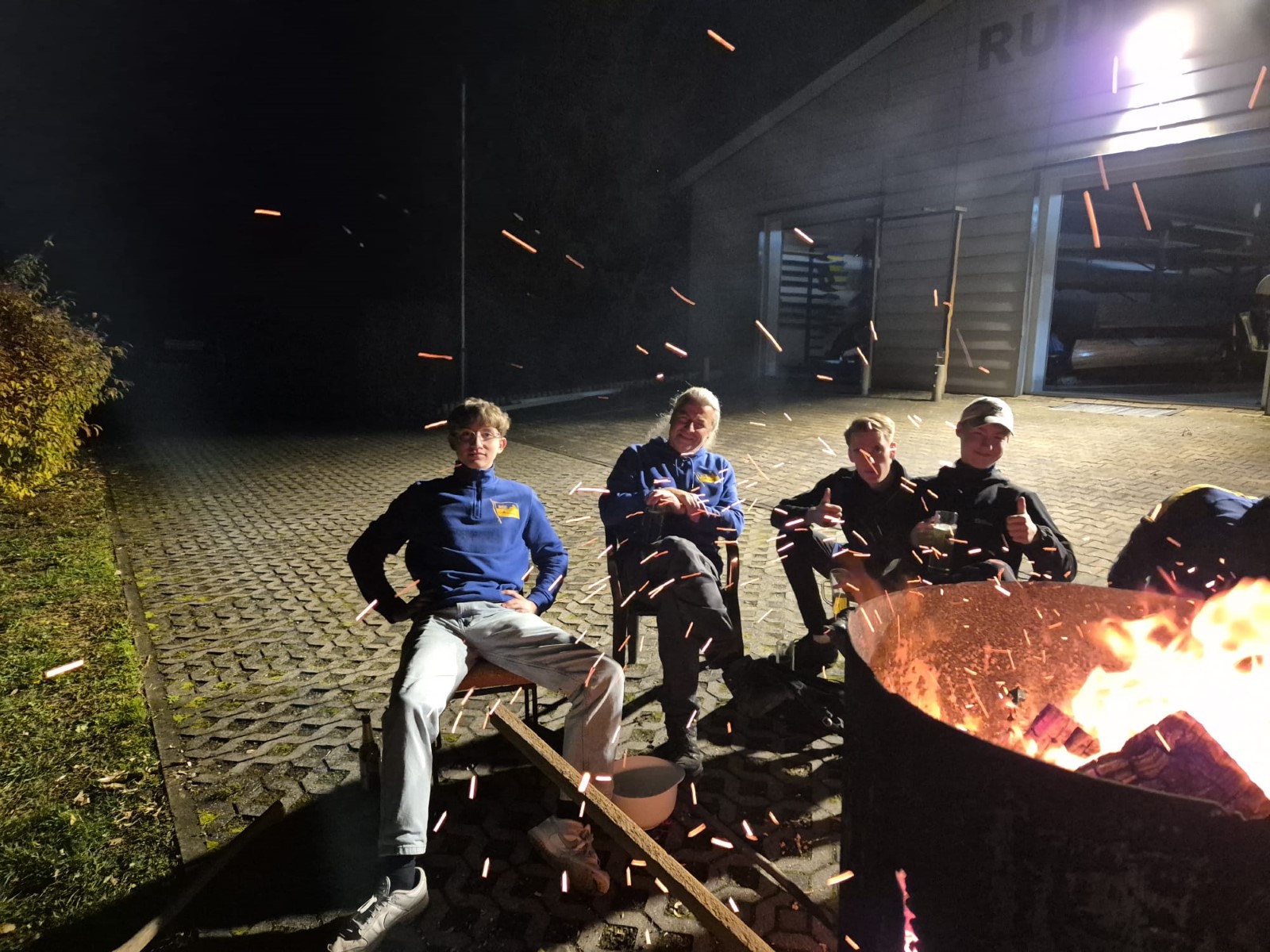 Prinzipiell war alles wie immer, am letzten Oktobersamstag 2025. Und wie immer gab es auch ein paar Abweichungen... Nur wenige Kinder und Jugendliche beteiligten sich diesmal am Ergometerwettstreit. Nudeln gab es trotzdem zu Mittag. Bei der Gig-Vierer-Vereinsmeisterschaft fanden sich zwei Mannschaften, um gesteuert vom Matthias gegeneinander anzutreten. Das Rennen machten Niclas, Arne, Colin und Johann mit fünf Sekunden Vorsprung. Die Ansprache der Vorsitzenden Silke Gans begann mit einem Gedenken an unseren allseits geschätzten Clubkameraden Günter Illgen, verstorben erst vor wenigen Tagen nach kurzer Krankheit. Es folgten ein Rückblick auf die vergangene Saison, der Ausblick auf Kommendes, die Begrüßung neuer Mitglieder, verschiedene Ehrungen und der Aufruf, ein letztes Mal für diese Saison „die Ruder zur Hand und die Boote zu Wasser zu lassen“. Das letztere wehte der Wind derweil auch immer mal wieder in leichten Schauern über alle hinweg, die sich auf der Mühlgrabenwiese versammelt hatten. Sie kamen nicht nur auf dem Wasserweg, sondern nach dem Kaffee- und Kuchen-Genuss auch über Land hinzu. Am Feuer, mit mal mehr, mal weniger Regenzeug ließ es sich aber aushalten. Würstchen und Stockbrot fanden genauso wie Getränke und Gesangseinlagen regen Zuspruch. Mit Einbruch der Dämmerung waren alle Boote wieder unter Dach und Fach. Ob gemütlich im Saal oder mehr oder weniger feucht vor der Bootshalle mit Feuertonne, Liedgut und Co... Es wurde noch bis weit in die Nacht hinein gefeiert. Großes Dankeschön an alle für das Engagement dafür!