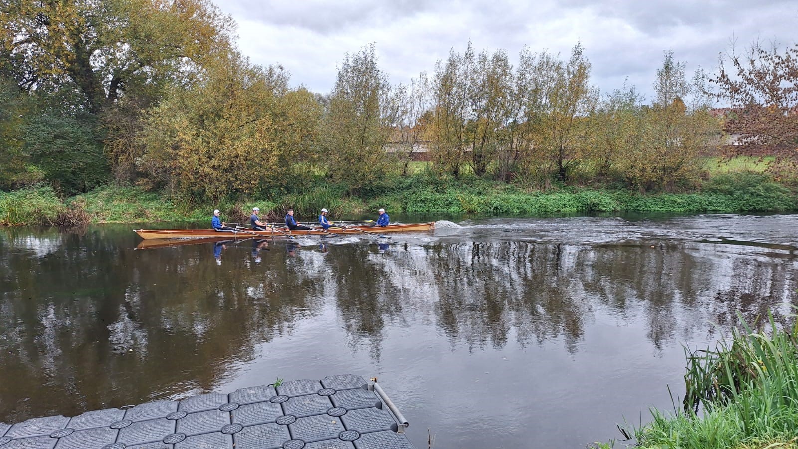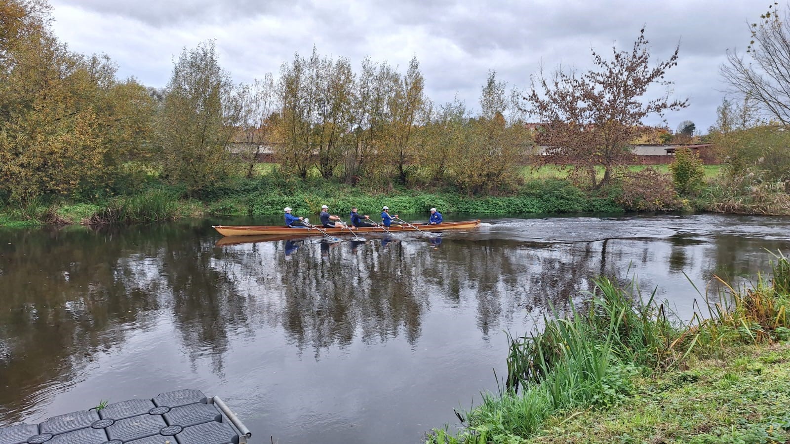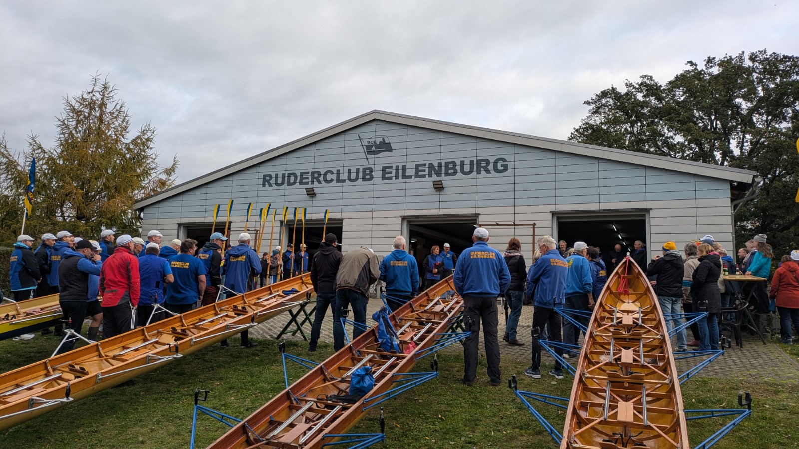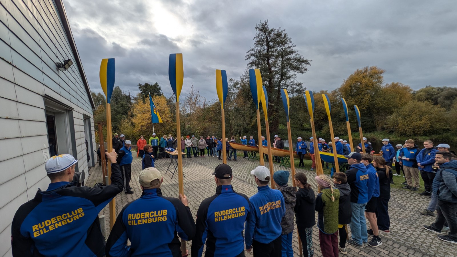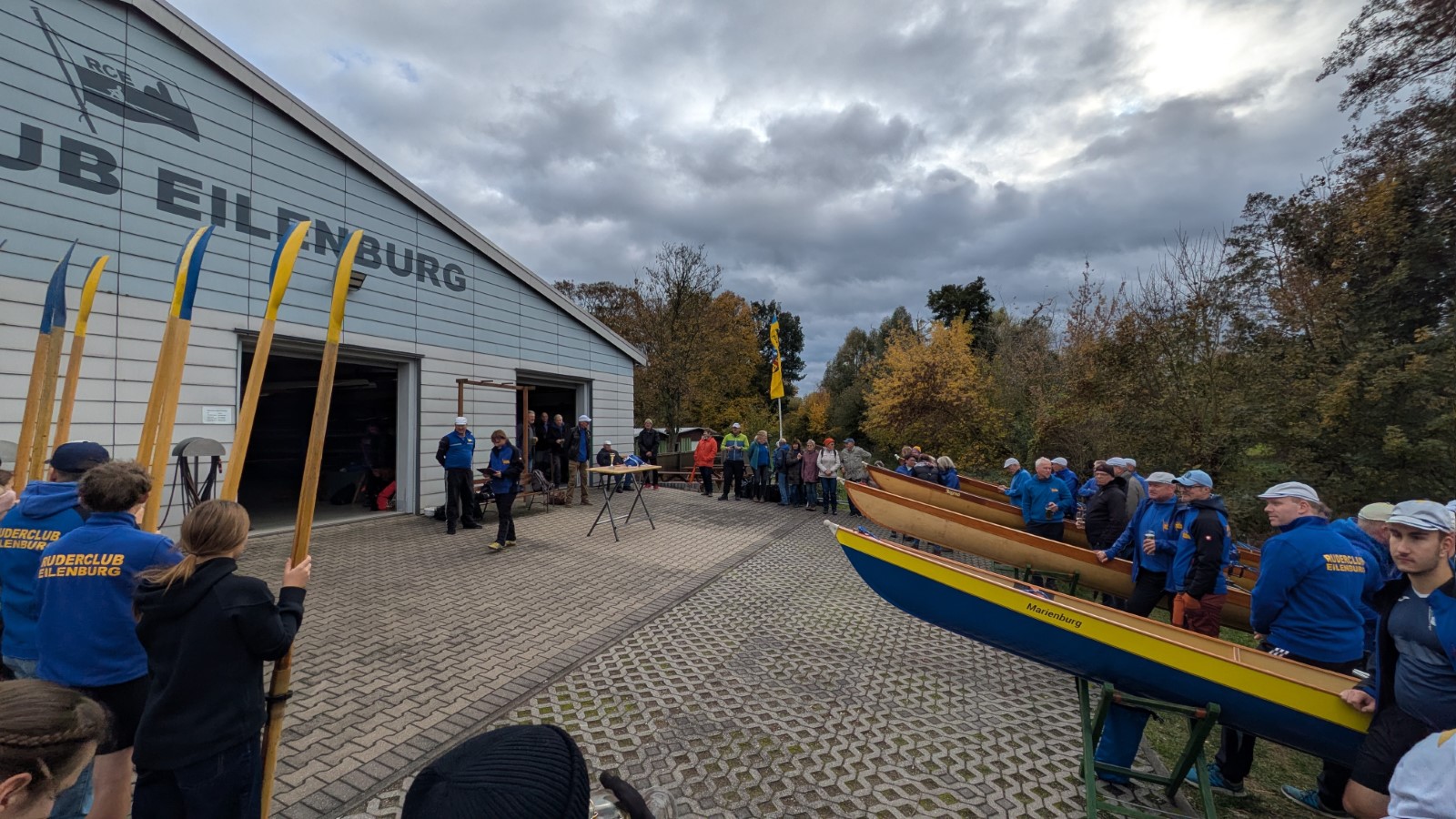 Prinzipiell war alles wie immer, am letzten Oktobersamstag 2025. Und wie immer gab es auch ein paar Abweichungen... Nur wenige Kinder und Jugendliche beteiligten sich diesmal am Ergometerwettstreit. Nudeln gab es trotzdem zu Mittag. Bei der Gig-Vierer-Vereinsmeisterschaft fanden sich zwei Mannschaften, um gesteuert vom Matthias gegeneinander anzutreten. Das Rennen machten Niclas, Arne, Colin und Johann mit fünf Sekunden Vorsprung. Die Ansprache der Vorsitzenden Silke Gans begann mit einem Gedenken an unseren allseits geschätzten Clubkameraden Günter Illgen, verstorben erst vor wenigen Tagen nach kurzer Krankheit. Es folgten ein Rückblick auf die vergangene Saison, der Ausblick auf Kommendes, die Begrüßung neuer Mitglieder, verschiedene Ehrungen und der Aufruf, ein letztes Mal für diese Saison „die Ruder zur Hand und die Boote zu Wasser zu lassen“. Das letztere wehte der Wind derweil auch immer mal wieder in leichten Schauern über alle hinweg, die sich auf der Mühlgrabenwiese versammelt hatten. Sie kamen nicht nur auf dem Wasserweg, sondern nach dem Kaffee- und Kuchen-Genuss auch über Land hinzu. Am Feuer, mit mal mehr, mal weniger Regenzeug ließ es sich aber aushalten. Würstchen und Stockbrot fanden genauso wie Getränke und Gesangseinlagen regen Zuspruch. Mit Einbruch der Dämmerung waren alle Boote wieder unter Dach und Fach. Ob gemütlich im Saal oder mehr oder weniger feucht vor der Bootshalle mit Feuertonne, Liedgut und Co... Es wurde noch bis weit in die Nacht hinein gefeiert. Großes Dankeschön an alle für das Engagement dafür!