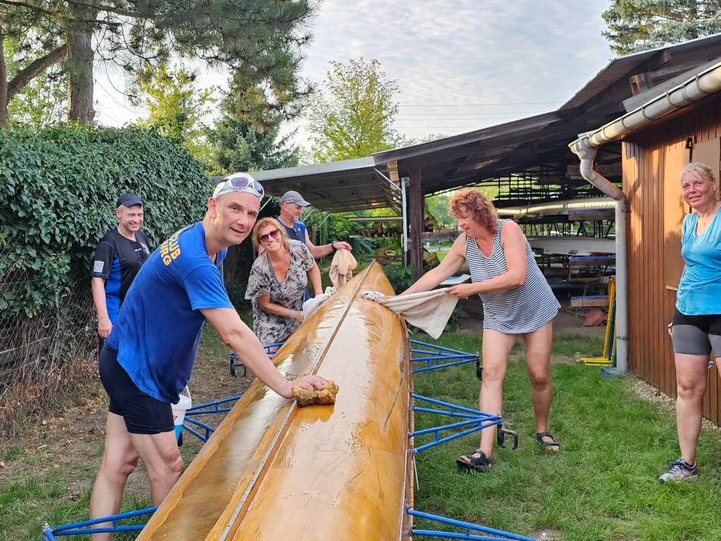 Zum Abend hin wurde es nochmal spannend, ob das Tagesziel zu schaffen ist. Es wurde nurmehr der schnellere Doppelvierer gefahren. Mancher ließ sich gar zu einem dritten Start überreden. Und das zum Teil nach 30 Jahren Ruder-Abstinenz! Gegen 19 Uhr war dann die Freude groß. Der Marathon-Erfolg wurde mit heftigen Umarmungen und Schluckigeklopfe auf dem Steg gefeiert.